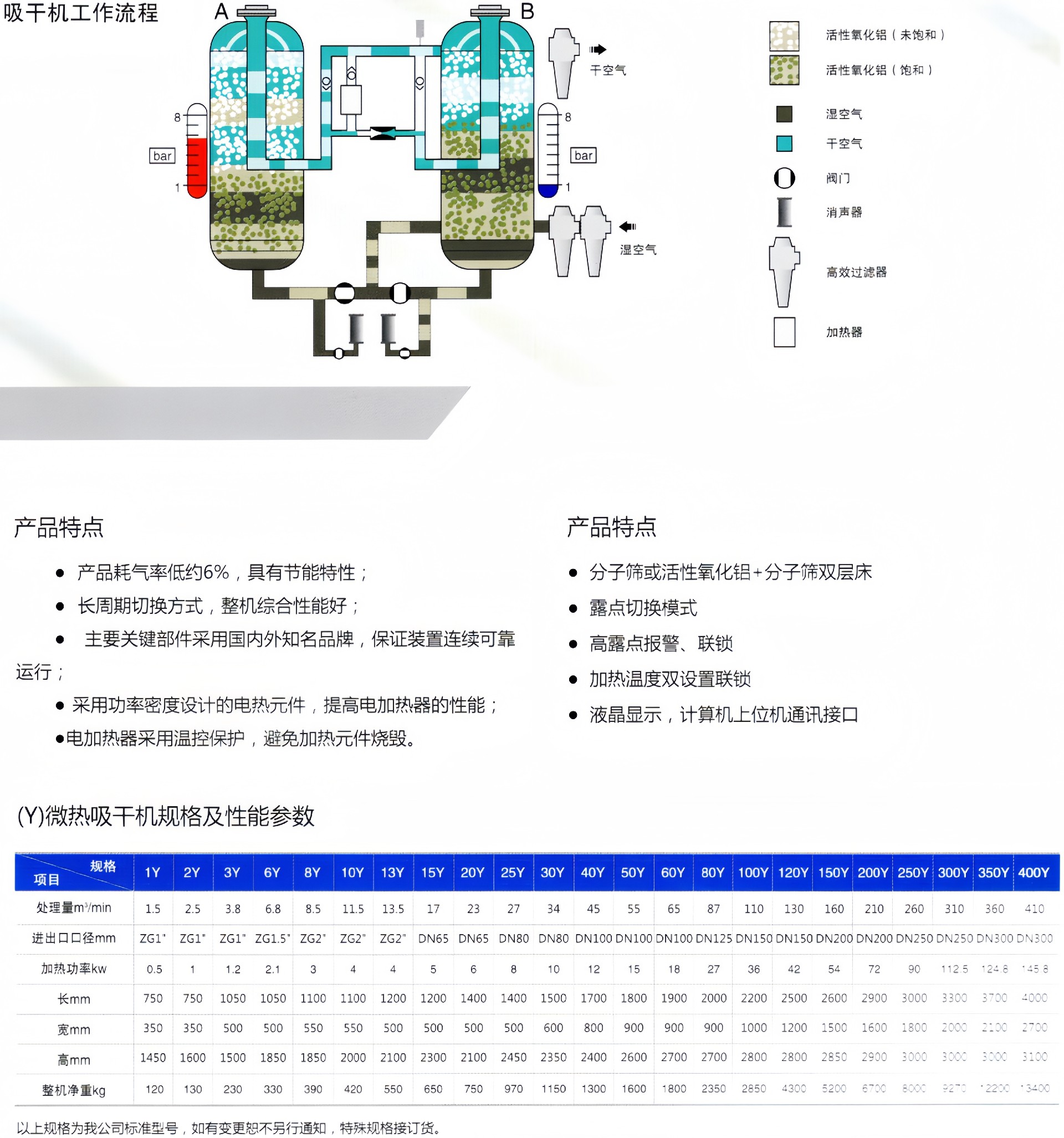 产品描述:产品介绍微热再生吸附式干燥机是我司设计和研制,并达到国内行业水平的节能型产品。本系列产品有热再生与无热再生的优点,对再生气采用微加热的形式,从而减少再生气耗量,达到节能的目的。它避免了无热再生干燥机切···